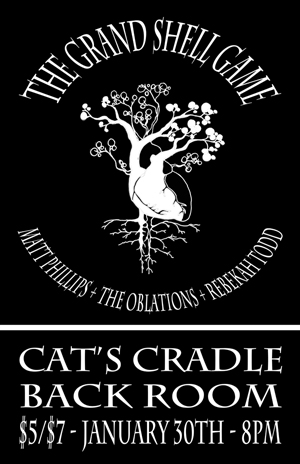 we're very happy to announce our first Carrboro show of the year at The Cat's Cradle Back Room on January 30th. we'll be joined by The Oblations and our great friends Matt Phillips and Rebekah Todd. it will be an amazing night. we'd love for you to be a part of it. we'll also have a live CD, t-shirts, and some stickers so you can deck your halls with bows of shell game. stay joyful all year long.